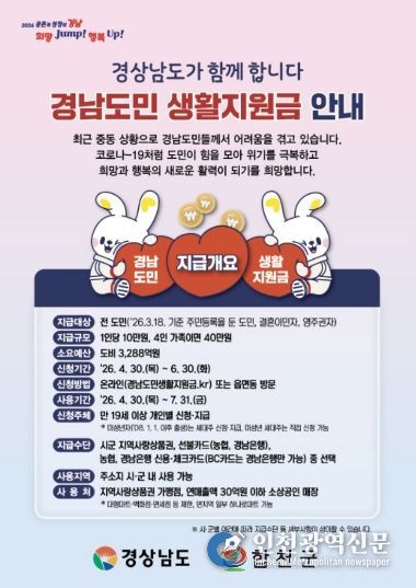 [인천광역신문] 최예준 기자 | 합천군은 정부의 고유가 피해지원금과는 별개로 추진되는 경남만의 민생안정 대책인 ‘경남도민 생활지원금’ 지급을 위한 준비를 완료하고, 4월 30일부터 각 읍·면사무소 및 온라인을 통해 신청을 받는다고 24일 밝혔다.