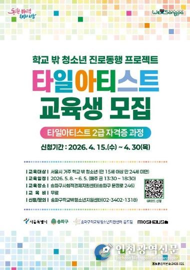 [인천광역신문] 최예준 기자 | 송파구는 서울시 ‘약자와의 동행’ 공모사업으로 학교 밖 청소년들의 사회진입과 자립을 돕기 위한 ‘타일아티스트 교육’을 실시한다고 24일 밝혔다.