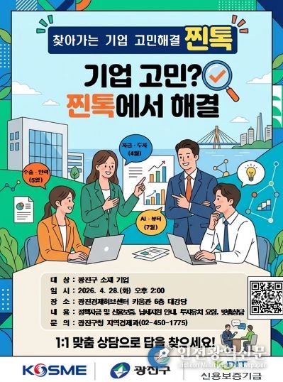 [인천광역신문] 최예준 기자 | 광진구가 중소벤처기업진흥공단과 협력하여 관내 기업들의 경영 애로사항을 현장에서 해결하는 '중소기업·스타트업 찐(眞)톡(Talk)' 프로그램이 본격 시행된다.