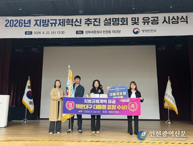 [인천광역신문] 최예준 기자 | 해운대구는 행정안전부 주관‘2025년 지방규제혁신 추진 성과평가’에서 우수한 성과를 인정받아 지난 22일 지방규제개혁 유공 대통령 표창을 수상하였다.