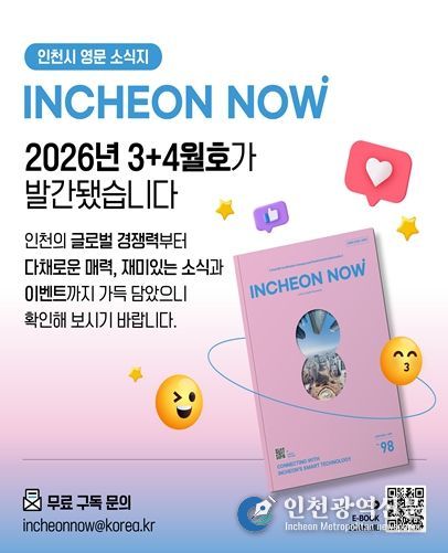 [인천광역신문] 최예준 기자 | 인천광역시는 도시의 혁신적인 정책과 차별화된 매력을 전 세계에 소개하는 영문소식지 '인천나우(Incheon Now)' 3·4월호(Vol. 98)를 발간했다고 밝혔다.