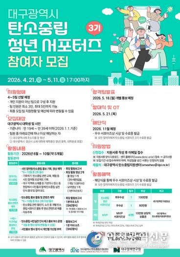 [인천광역신문] 최예준 기자 | 대구광역시는 기후위기 대응과 탄소중립 실천문화 확산을 위해 ‘대구시 탄소중립 청년 서포터즈 3기’ 참여자를 5월 11일까지 모집한다.