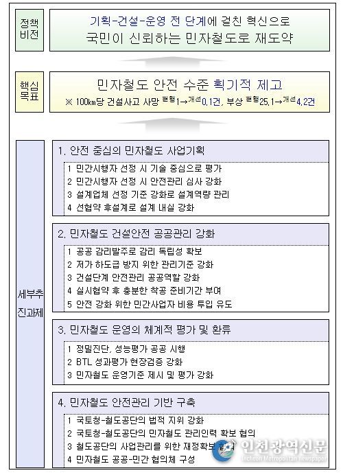 국토부는 민자철도 사업 패러다임을 효율성에서 안전으로 전환하는 것을 목표로 ‘사업기획-건설-운영 전 단계’에서 개선과제를 도출하는 한편, 국민의 눈높이에 맞는 안전한 민자철도 구축을 위한 공공역할 강화 방안을 모색했다.