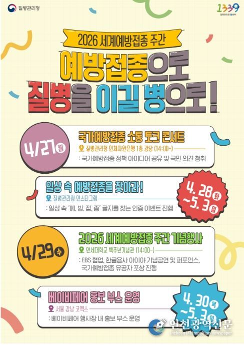 [인천광역신문] 최예준 기자 | 질병관리청은 세계보건기구(WHO)가 정한 세계예방접종주간(매년 4월 마지막 주)을 기념하여 4월 27일부터 5월 3일까지 일주일 동안'2026 예방접종주간행사'를 운영한다.