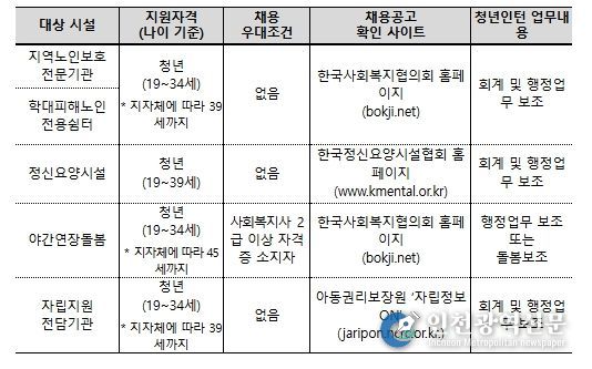 이번 모집을 통해 선발되는 479명의 청년인턴은 전국 아동·노인·정신요양 시설 등 5개 유형의 시설에서 근무하게 된다.