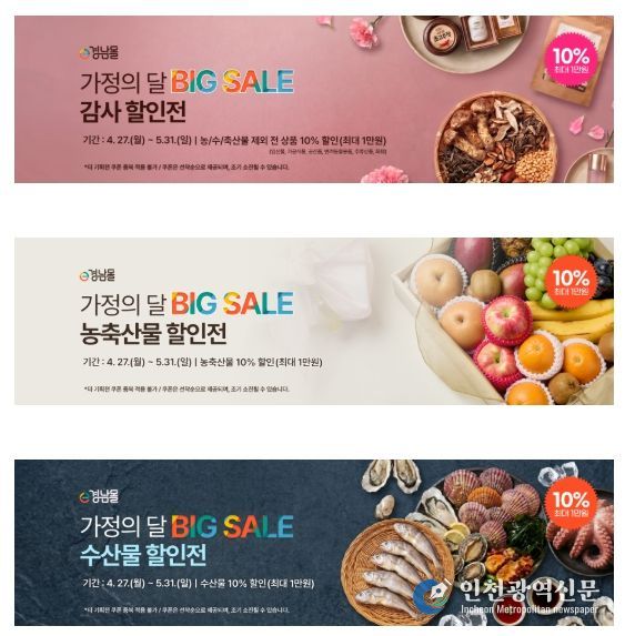 [인천광역신문] 최예준 기자 | 경상남도와 (재)경상남도투자경제진흥원이 운영하는 e경남몰(egnmall.kr)은 5월 가정의 달을 맞이해 4월 27일부터 예산 소진 시까지 전 품목을 대상으로 한 대규모 할인 기획전을 진행한다.