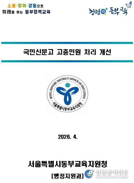 [인천광역신문] 최예준 기자 | 서울특별시동부교육지원청은 기존의 처리기한과 답변형식 중심의 민원관리 체계에서 벗어나, 민원 성격에 따른 맞춤형 대응과 관리자 책임을 강화하는 방향으로 민원 처리 체계를 개선한다.