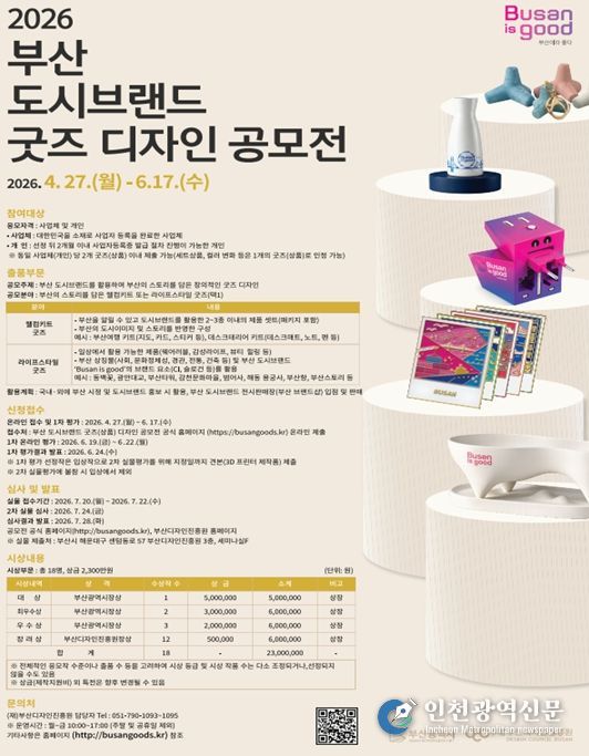 [인천광역신문] 최예준 기자 | 부산시와 (재)부산디자인진흥원은 오늘(27일)부터 6월 17일까지 '2026 부산 도시브랜드 굿즈(상품) 디자인 공모전'을 개최한다고 밝혔다.