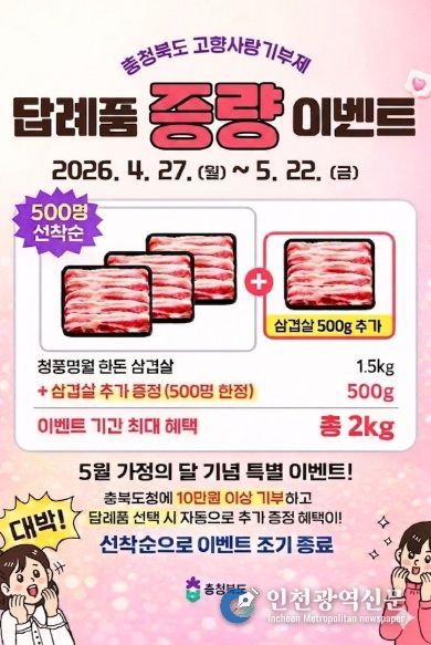 [인천광역신문] 최예준 기자 | 충북도가 가정의 달을 맞아 지역사랑과 나눔 문화를 확산하기 위해 ‘고향사랑기부제’ 답례품인 한돈 증량 이벤트를 4월 27일부터 5월 22일까지 진행한다.