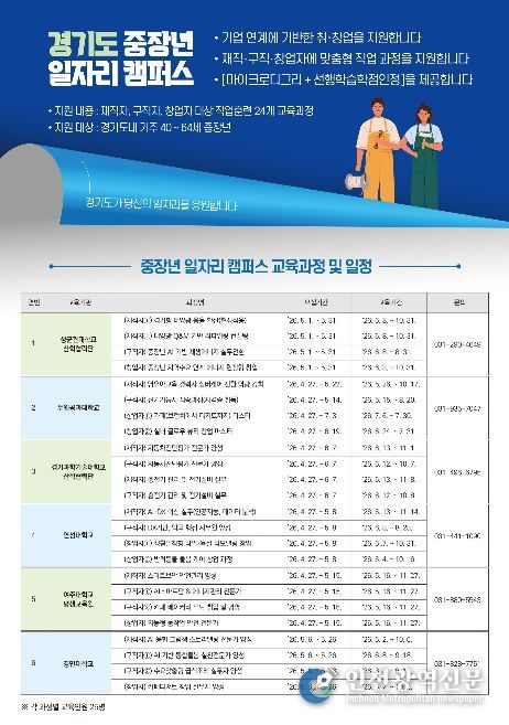 [인천광역신문] 최예준 기자 | 경기도가 중장년층의 재취업과 창업을 지원하기 위한 실무형 직업훈련 ‘중장년 일자리캠퍼스’를 올해 처음 추진하며 직업훈련 24개 과정별 25명씩 총 600명의 교육생을 모집한다.