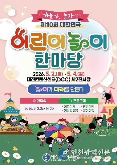 [인천광역신문] 최예준 기자 | 대전시교육청은 제104회 어린이날을 맞아 오는 5월 2일부터 4일까지 3일간 대전컨벤션센터(DCC) 제2전시장에서 ‘제10회 대한민국 어린이 놀이 한마당’을 개최한다고 밝혔다.