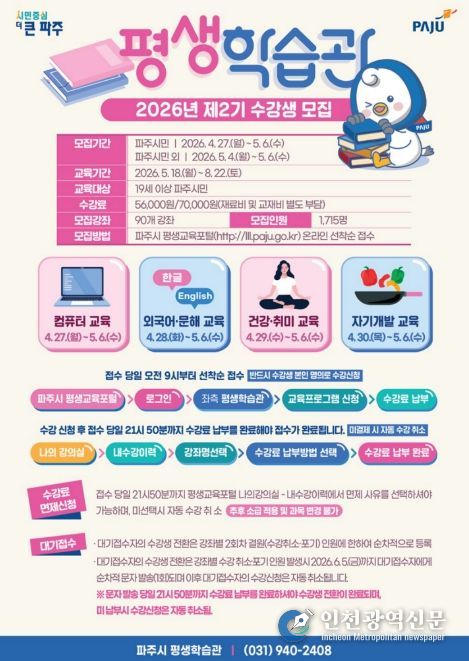 [인천광역신문] 최예준 기자 | 파주시 평생학습관은 시민의 평생학습 기회를 확대하기 위해 '2026년 제2기 정규강좌’수강생을 오는 4월 27일부터 5월 6일까지 모집한다.