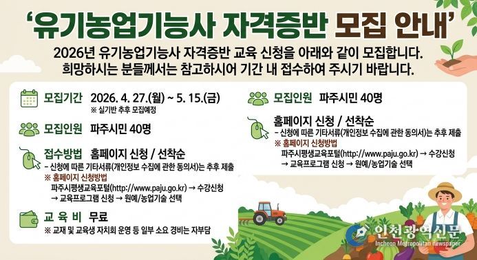 [인천광역신문] 최예준 기자 | 파주시농업기술센터는 친환경농업 분야 농업 전문 인력 육성을 위한 '2026년 유기농업기능사 자격증 취득’교육생을 4월 27일부터 5월 15일까지 모집한다.