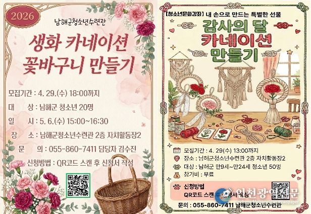 [인천광역신문] 최예준 기자 | 남해군 청소년수련관은 가정의 달 5월과 어버이날을 맞아 청소년 대상 문화체험 프로그램 ‘카네이션 만들기 원데이클래스’를 운영한다고 밝혔다.