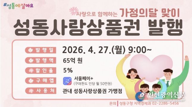 구 관계자는 “치솟는 물가로 모두가 어려운 시기이지만, 이번 성동사랑상품권 발행이 가계에는 든든한 보탬이 되고 소상공인들에게는 활력을 불어넣는 마중물이 되길 바란다”며, “가족의 따뜻함을 나누는 5월, 상품권 사용을 통해 지역 경제가 활짝 웃을 수 있기를 기대한다”고 말했다.