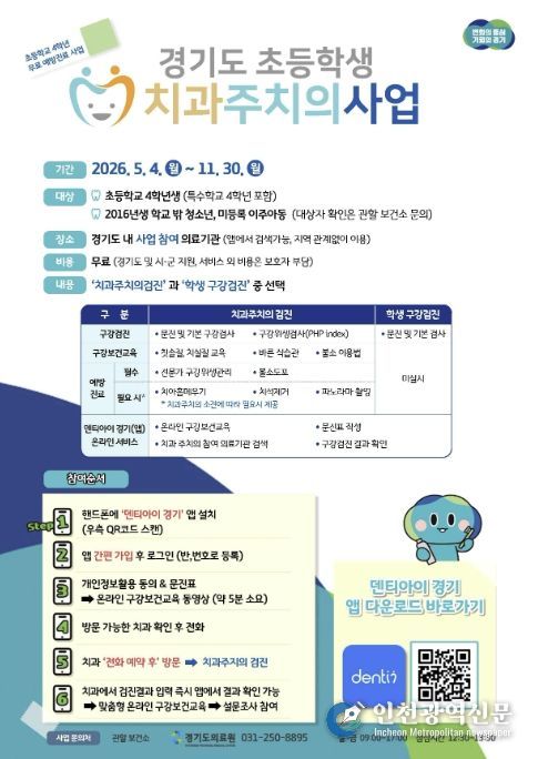 [인천광역신문] 최예준 기자 | 안산시는 경기도와 협력해 관내 초등학교 4학년 학생을 대상으로 ‘초등학생 치과주치의 사업’을 추진한다고 27일 밝혔다.