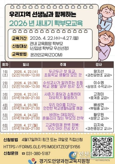 [인천광역신문] 최예준 기자 | 경기도안양과천교육지원청은 오는 4월 22부터 27일까지 관내 신입생 학부모를 대상으로 ‘우리지역 선생님과 함께하는 2026년 새내기 학부모 교육’을 개최한다.