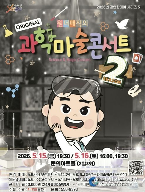 [인천광역신문] 최예준 기자 | 문경문화예술회관에서는 5월 어린이 달을 맞아 마술과 과학의 경계를 넘나들며 온가족 모두가 재미있게 관람할 수 있는 과학마술콘서트 시즌2 공연을 5월 15일 19:30, 16 16:00, 19:30 (2일 3회)에 문희아트홀에서 개최한다.