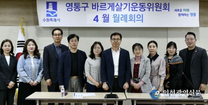 [인천광역신문] 최예준 기자 | 수원시 영통구는 지난 24일 바르게살기운동 영통구지도위원회가 영통구청 상황실에서 각 동 위원장 및 총무 등 14명이 참석한 가운데 4월 월례회의를 개최했다고 밝혔다.