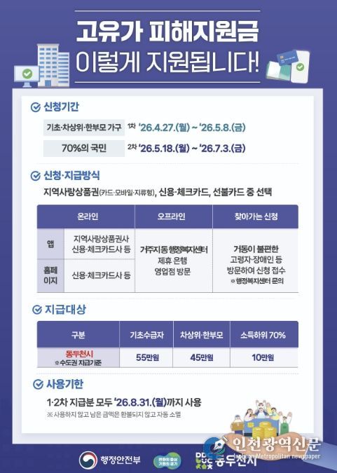 [인천광역신문] 최예준 기자 | 동두천시가 중동발 고유가와 고물가로 인한 시민 부담을 완화하고 지역경제 회복을 지원하기 위해 ‘고유가 피해지원금’을 지급한다.