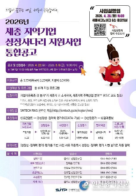[인천광역신문] 최예준 기자 | (재)세종테크노파크는 ‘2026년 세종 지역기업 성장사다리 지원사업’ 참여기업을 모집한다고 27일 밝혔다.