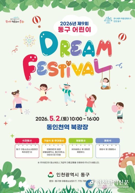 [인천광역신문] 최예준 기자 | 인천 동구는 오는 2일 동인천역 북광장에서 제104회 어린이날을 맞아‘2026년 제9회 동구 어린이 Dream Festival’을 개최한다고 밝혔다.