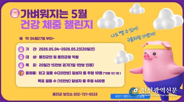 [인천광역신문] 최예준 기자 | 옹진군은 군민의 일상 속 걷기 실천을 유도하고 비만 예방 및 건강체중 관리를 지원하기 위해 5월 4일부터 23일까지 20일간 '가벼워지는 5월, 건강체중'챌린지 참가자를 4월 27일부터 모집한다고 밝혔다.