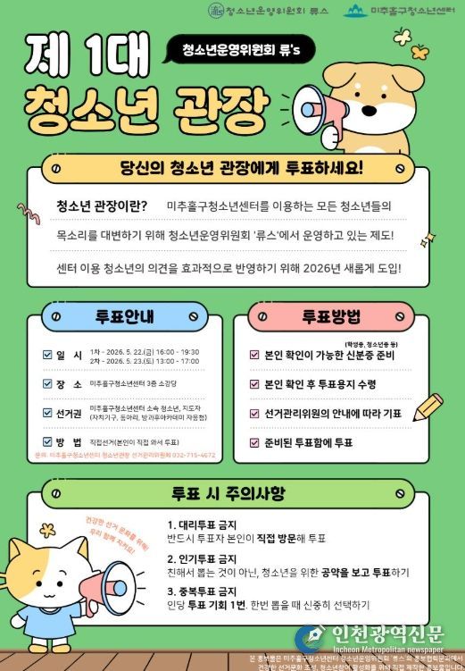 투표는 미추홀구청소년센터 3층 소강당에서 직접 투표 방식으로 이뤄지며, 1차 투표는 5월 22일 16:00~19:30, 2차 투표는 5월 23일 13:00~17:00에 각각 실시된다.