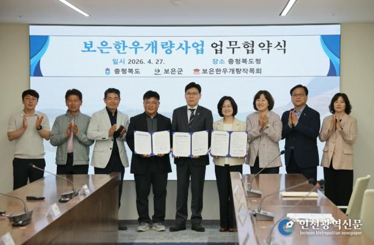 [인천광역신문] 최예준 기자 | 충북 보은군은 27일 충북도청 여는마당에서 충청북도, 보은한우개량작목회와 함께 한우 개량 고도화와 우량 유전자원 확산을 위한 업무협약을 체결하고 보은한우 경쟁력 강화를 위한 추진 기반을 마련했다.