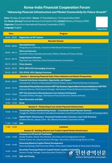 [인천광역신문] 최예준 기자 | 금융위원회 이억원 위원장은 4월 19일~25일 4박 7일 일정으로 대통령의 인도·베트남 해외순방에 동행했다. 주요 일정으로는 한국 금융회사 해외진출 및 영업 확대 지원을 위한 고위급 정부회담, 금융중심지 육성 및 국경간 QR 결제망 연동 등을 위한 금융협력포럼 개최, 현지 금융회사·기업 간담회 등을 진행했다. 이번 방문은 고속 성장 중인 두 핵심 파트너 국가와의 ‘전략적 협력 고도화’라는 목표를 금융분야에서 적극 뒷받침하기 위해 마련된 것으로, 인도의 경우 금융위원장으로서는 첫 방문이다.