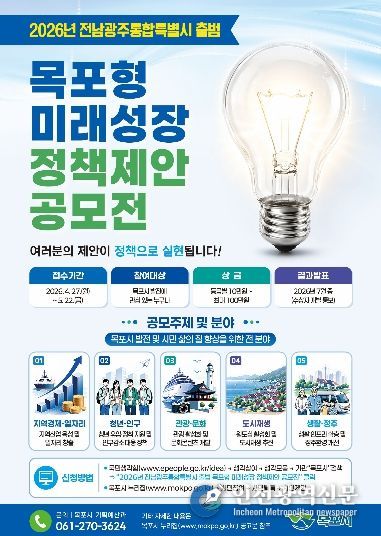 [인천광역신문] 최예준 기자 | 목포시가 전남·광주 통합특별시 출범에 대비하고 지역의 미래 성장동력을 발굴하기 위해 ‘목포형 미래성장 정책제안 공모전’을 개최한다.