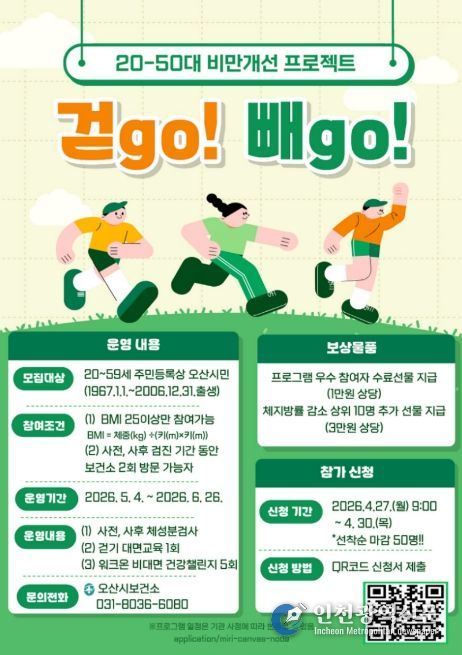 [인천광역신문] 최예준 기자 | 오산시보건소는 최근 젊은 층의 비만율 증가에 대응해 체질량지수(BMI) 25kg/㎡ 이상인 20~50대 오산시민을 대상으로 걷기 기반 비만 개선 프로그램 ‘걷GO 빼GO’를 운영한다고 밝혔다.