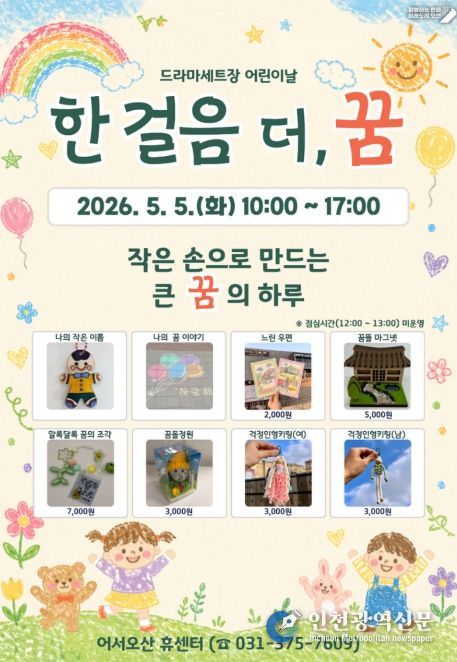 [인천광역신문] 최예준 기자 | 오산시는 오는 5월 5일 어린이날을 맞아 오산 드라마세트장 일원에서 어린이와 가족이 함께 즐길 수 있는 체험 프로그램 ‘한 걸음 더, 꿈’을 운영한다고 밝혔다.