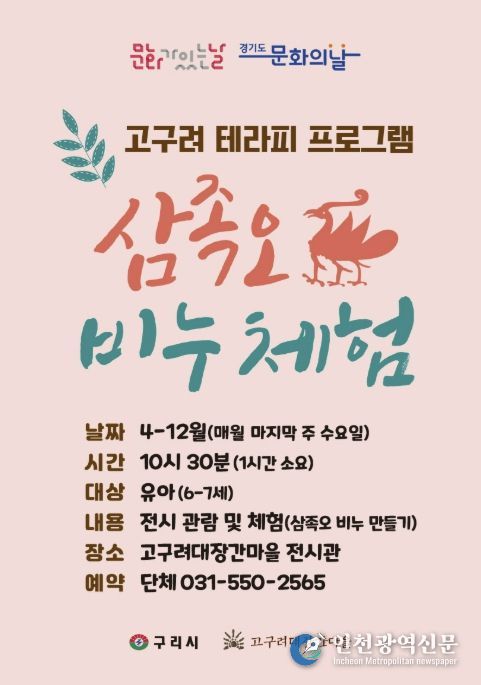 [인천광역신문] 최예준 기자 | 구리시는 4월부터 고구려대장간마을에서 매월 마지막 주 수요일 ‘문화가 있는 날’을 맞아 ‘삼족오 비누 체험! 고구려 치료 프로그램’을 운영한다고 밝혔다.