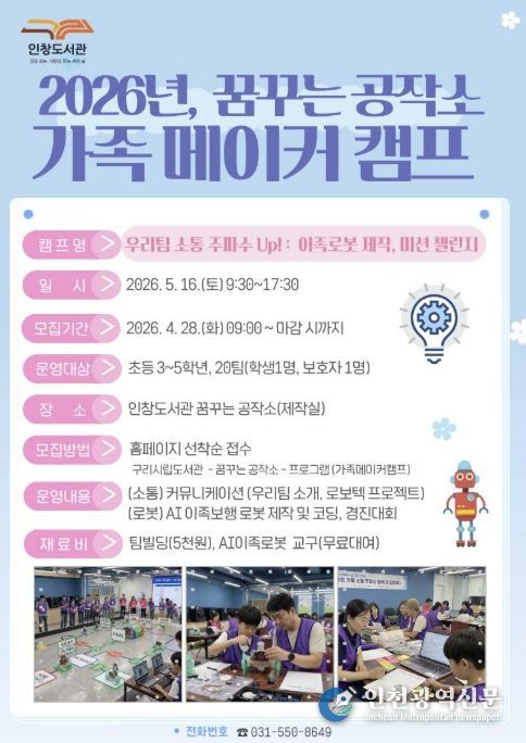 [인천광역신문] 최예준 기자 | 구리시 인창도서관‘꿈꾸는 공작소’는 오는 5월 16일 초등학생 자녀와 보호자가 함께 참여해 가족 간 유대감을 높이고 인공지능을 체험하는 '우리 팀 소통 주파수 Up! : 이족로봇 제작, 미션 챌린지' 가족 메이커 캠프를 운영한다고 밝혔다.