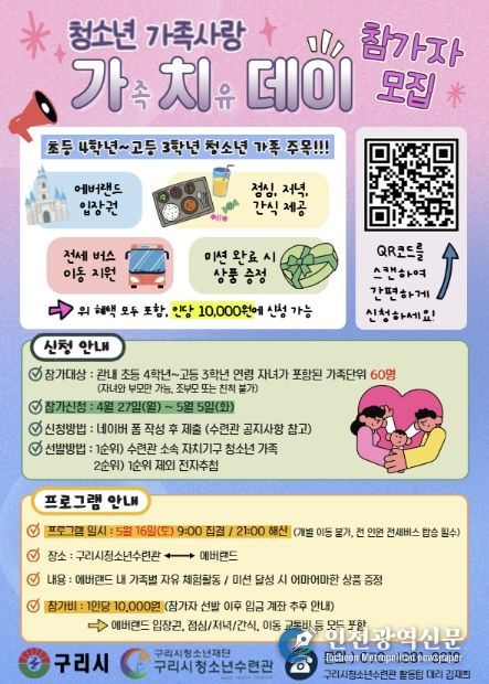 [인천광역신문] 최예준 기자 | 구리시청소년재단 청소년수련관은 가정의 달을 맞아 오는 5월 16일 관내 청소년 가족을 대상으로 ‘청소년 가족사랑 가치(가족치유)데이’를 운영하며, 참가 가족을 4월 27일부터 5월 5일까지 모집한다고 밝혔다.