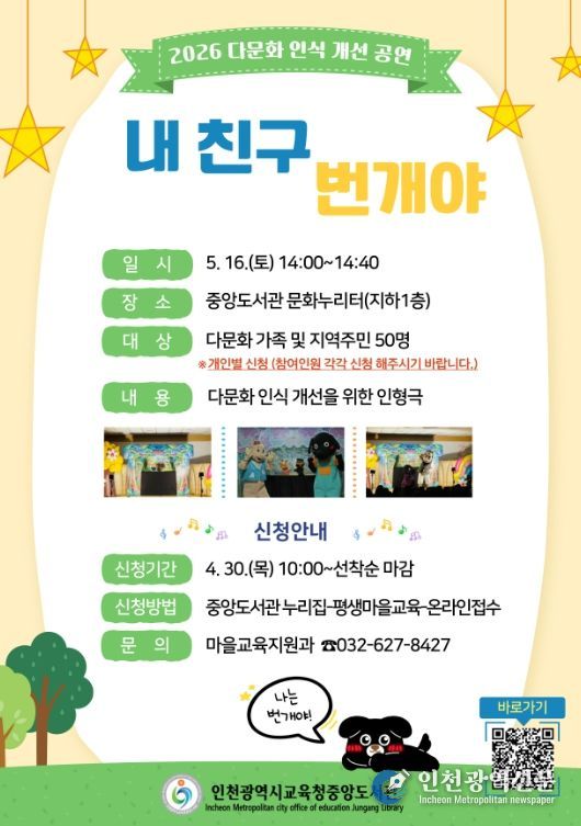 [인천광역신문] 최예준 기자 | 인천광역시교육청중앙도서관은 오는 5월 16일 다문화 인식 개선 공연 ‘내 친구 번개야’를 운영한다.