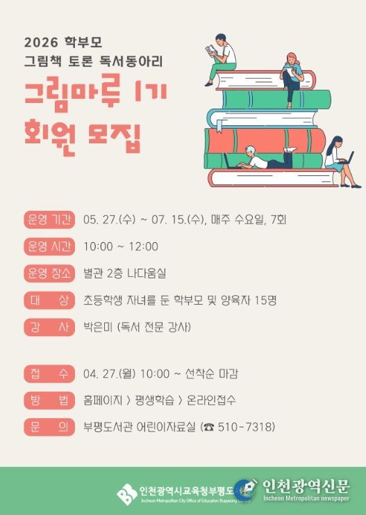 [인천광역신문] 최예준 기자 | 인천광역시교육청부평도서관은 학부모의 독서 역량을 강화하고 자녀와의 소통을 돕기 위해 2026년 상반기 학부모 독서동아리 ‘그림마루 1기’ 참여자를 모집한다.