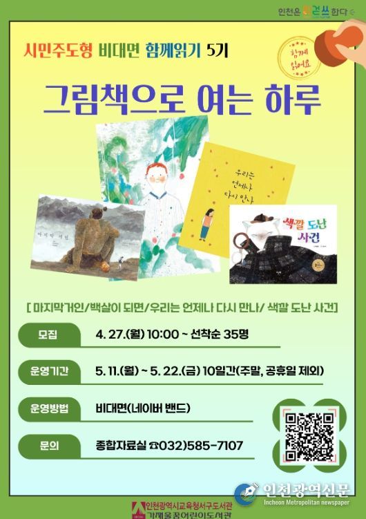 [인천광역신문] 최예준 기자 | 인천광역시교육청서구도서관(관장 정연순)은 2026년 시민주도형 비대면 함께읽기 5기로, 5월 11일부터 5월 22일까지 ‘그림책으로 여는 하루’ 프로그램을 운영한다.