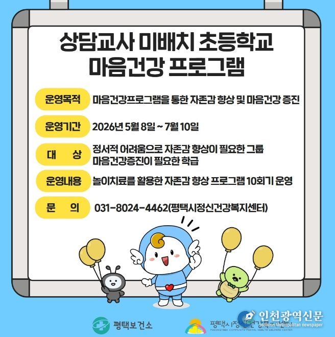 [인천광역신문] 최예준 기자 | 평택시는 상담교사가 배치되지 않은 초등학교 학생들의 정신건강 지원을 위해 ‘마음건강 프로그램’을 운영한다고 밝혔다.