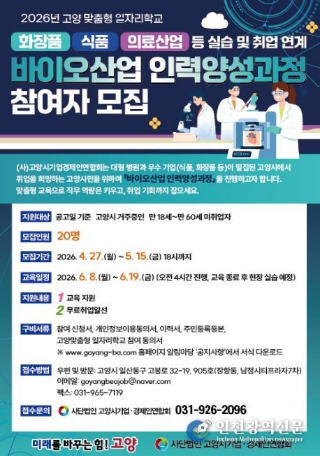 [인천광역신문] 최예준 기자 | 고양특례시는 2026년 고양맞춤형 일자리학교 공모사업 중 ‘바이오산업 인력 양성과정’의 참여자를 모집한다.