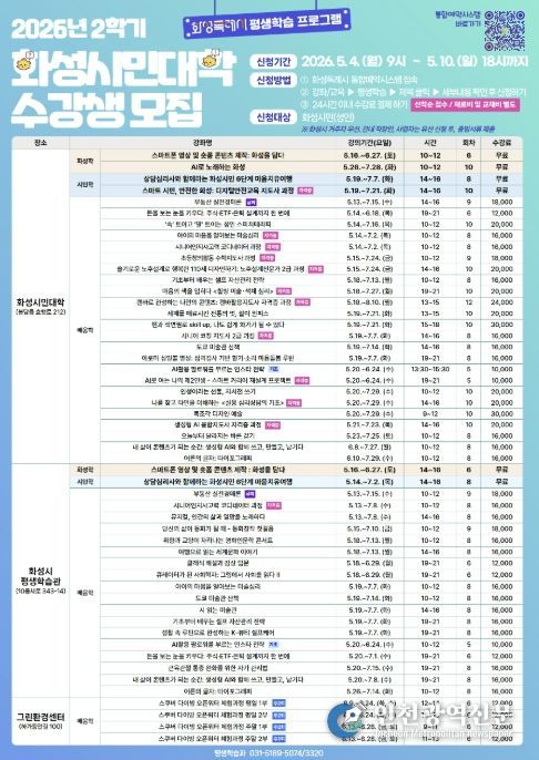 [인천광역신문] 최예준 기자 | 화성특례시는 2026년 화성시민대학 2학기 수강생을 오는 5월 4일부터 5월 10일까지 선착순으로 모집한다고 밝혔다.