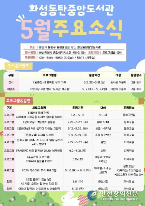 [인천광역신문] 최예준 기자 | 화성동탄중앙도서관이 어린이날과 가정의 달을 맞아 5월 한 달간 도서관 이용자와 시민을 대상으로 자료실과 3층 공공의 마당 등에서 다양한 문화행사를 운영한다.