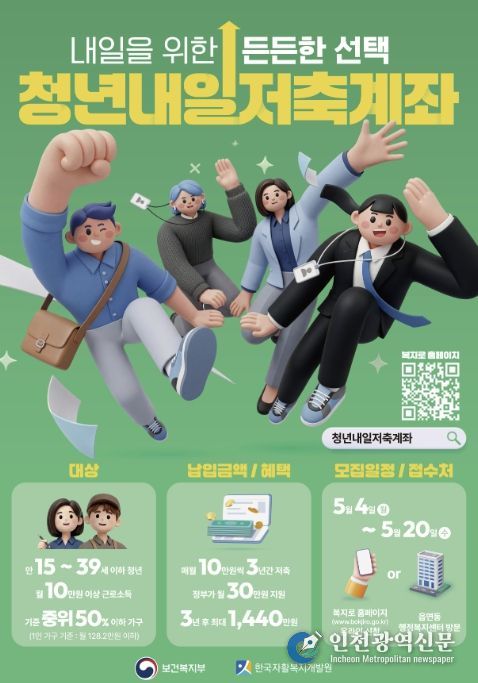 [인천광역신문] 최예준 기자 | 부천시는 일하는 저소득층 청년의 안정적인 사회 정착과 자산 형성을 지원하기 위해 ‘2026년 청년내일저축계좌’ 신규 가입자를 5월 4일부터 5월 20일까지 모집한다.