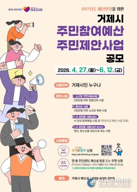 [인천광역신문] 최예준 기자 | 거제시는 2027년도 본예산 편성을 앞두고 재정운용의 투명성과 시민에게 공감받는 예산편성을 실현하고자 오는 6월 12일까지‘주민참여예산 제안사업 공모’를 실시한다.