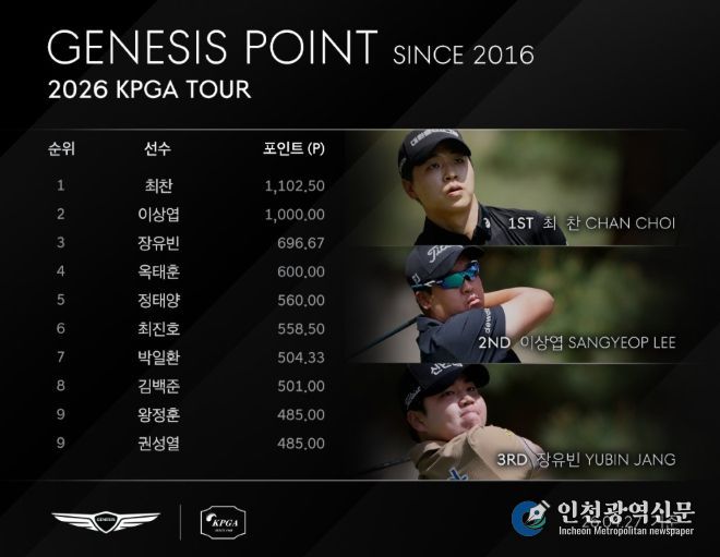 [인천광역신문] 최예준 기자 | 최찬(29.(주)대원플러스그룹)이 ‘2026 우리금융챔피언십’에서 KPGA 투어 첫 우승과 함께 제네시스 포인트 최상단에 이름을 올렸다. ‘KPGA 투어 QT’를 통해 2022년 KPGA 투어에 데뷔하고 32번째 대회 출전 만에 이룬 우승이다.