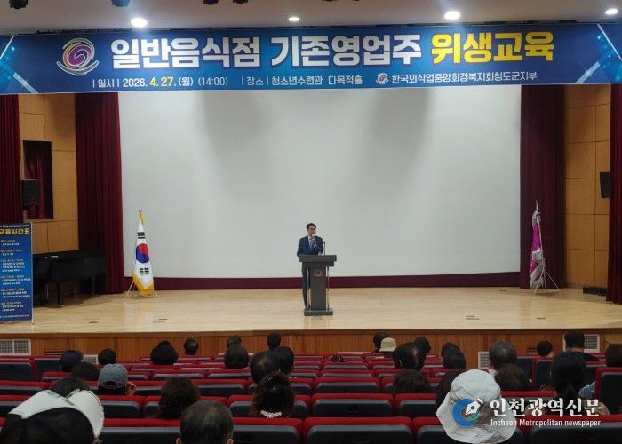 [인천광역신문] 최예준 기자 | 청도군은 27일 청소년수련관 다목적홀에서 2026년도 일반음식점 기존 영업주 위생교육을 실시했다.