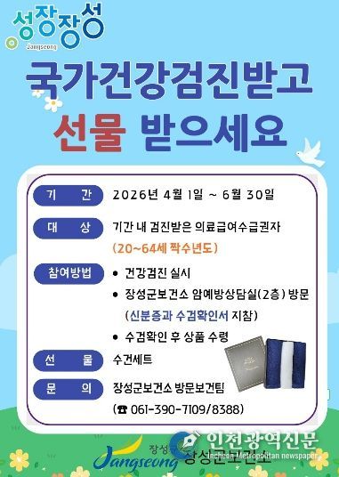 [인천광역신문] 최예준 기자 | 장성군보건소가 의료급여를 받는 주민을 대상으로 ‘국가건강검진 참여 응원 이벤트’를 운영한다.