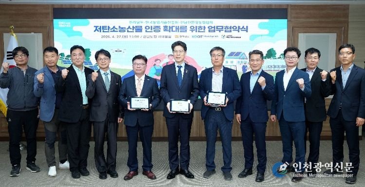 [인천광역신문] 최예준 기자 | 전라남도는 27일 도청에서 한국농업기술진흥원, 전남친환경농업협회와 함께 저탄소 농산물 인증 확대와 탄소 저감 실천을 위한 업무협약을 했다.