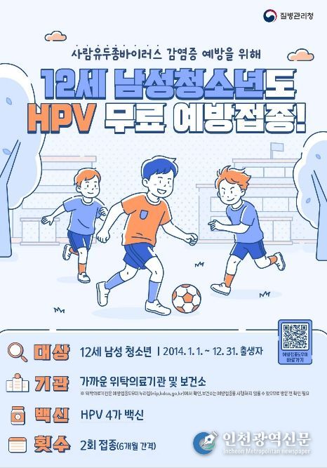 이번 사업은 오는 5월 6일부터 시행된다. 지원 대상은 2026년 기준 2014년생 남아(12세)로, HPV 백신(HPV4가)을 6개월 간격으로 총 2회 무료 접종받을 수 있다.